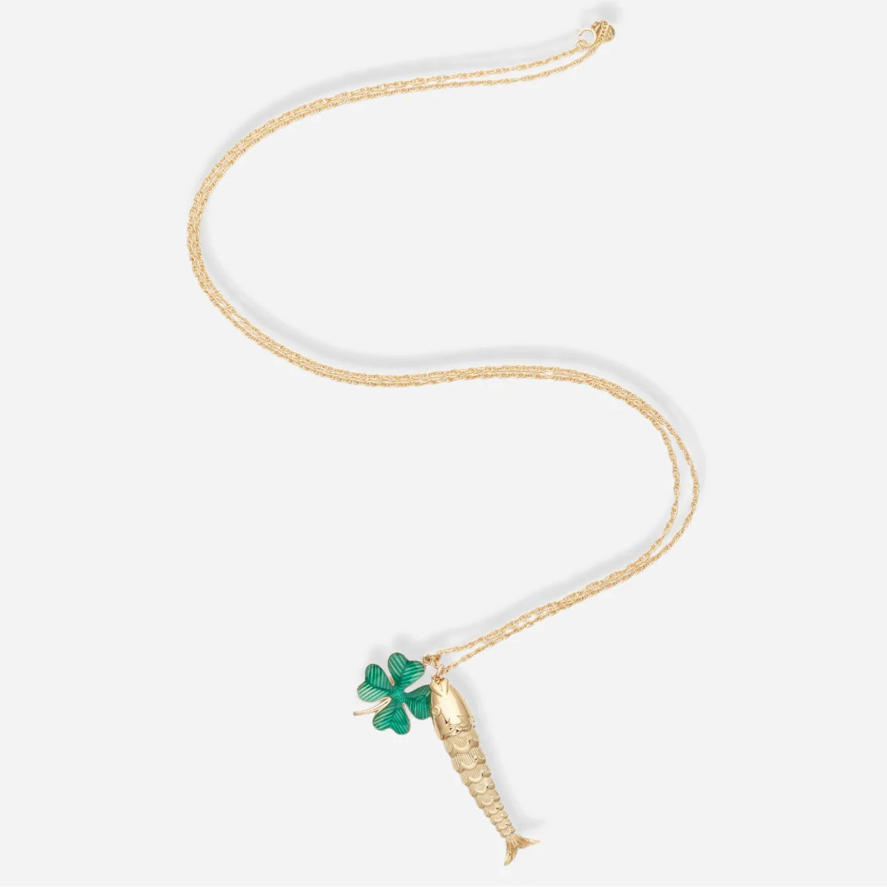 Le sautoir Némo se compose d'un trèfle émaillé de couleur, de 2cm de diamètre et d'un poisson articulé en laiton doré à l'or 18 carats d'une longueur de 5,5 cm.