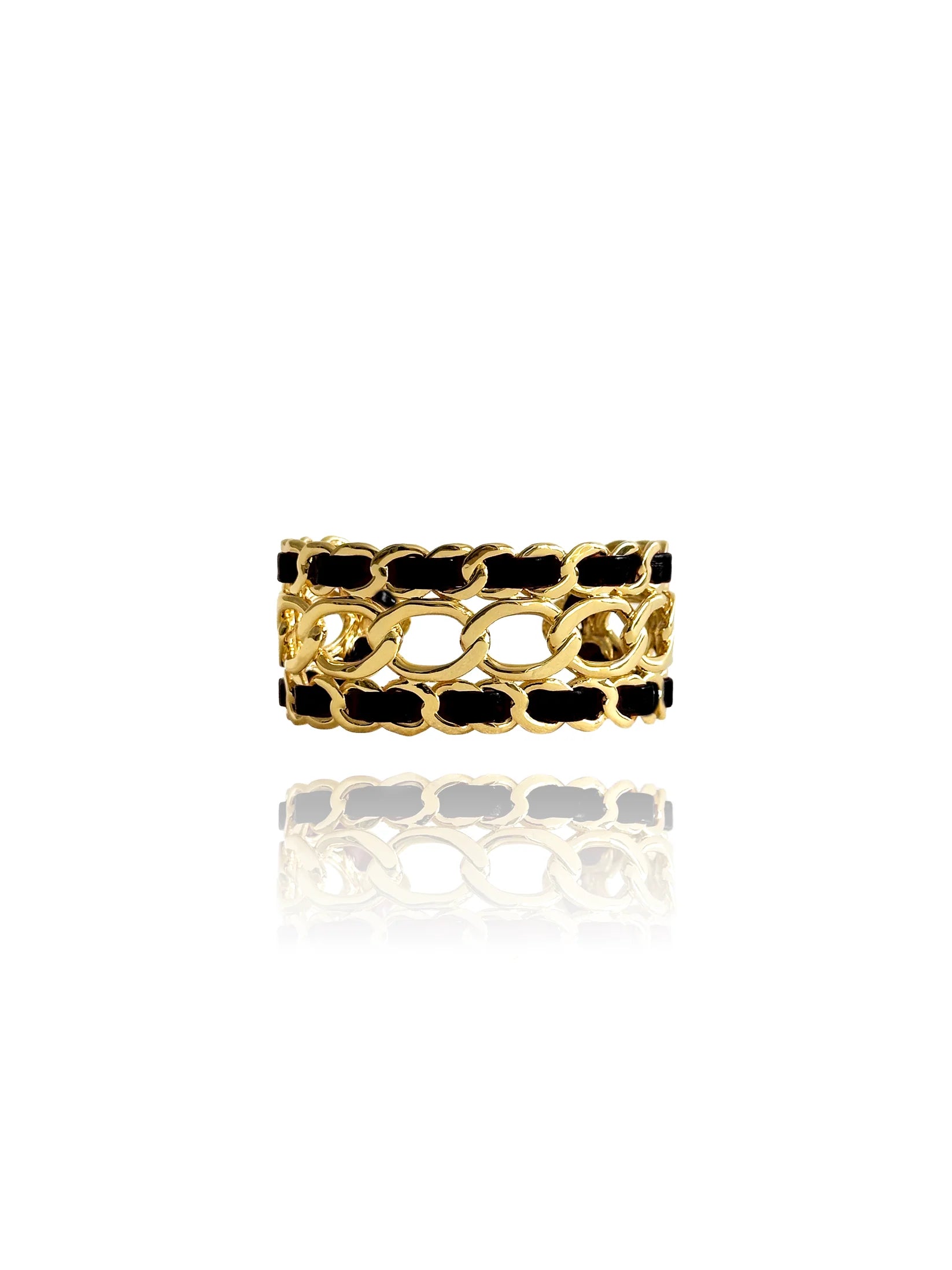 Faite de chaînes et tissée de simili-cuir et soie, la manchette "Décembre" ne passera pas inaperçue quelques soient les occasions. Entièrement (et très facilement) ajustable, ajourée et légère.