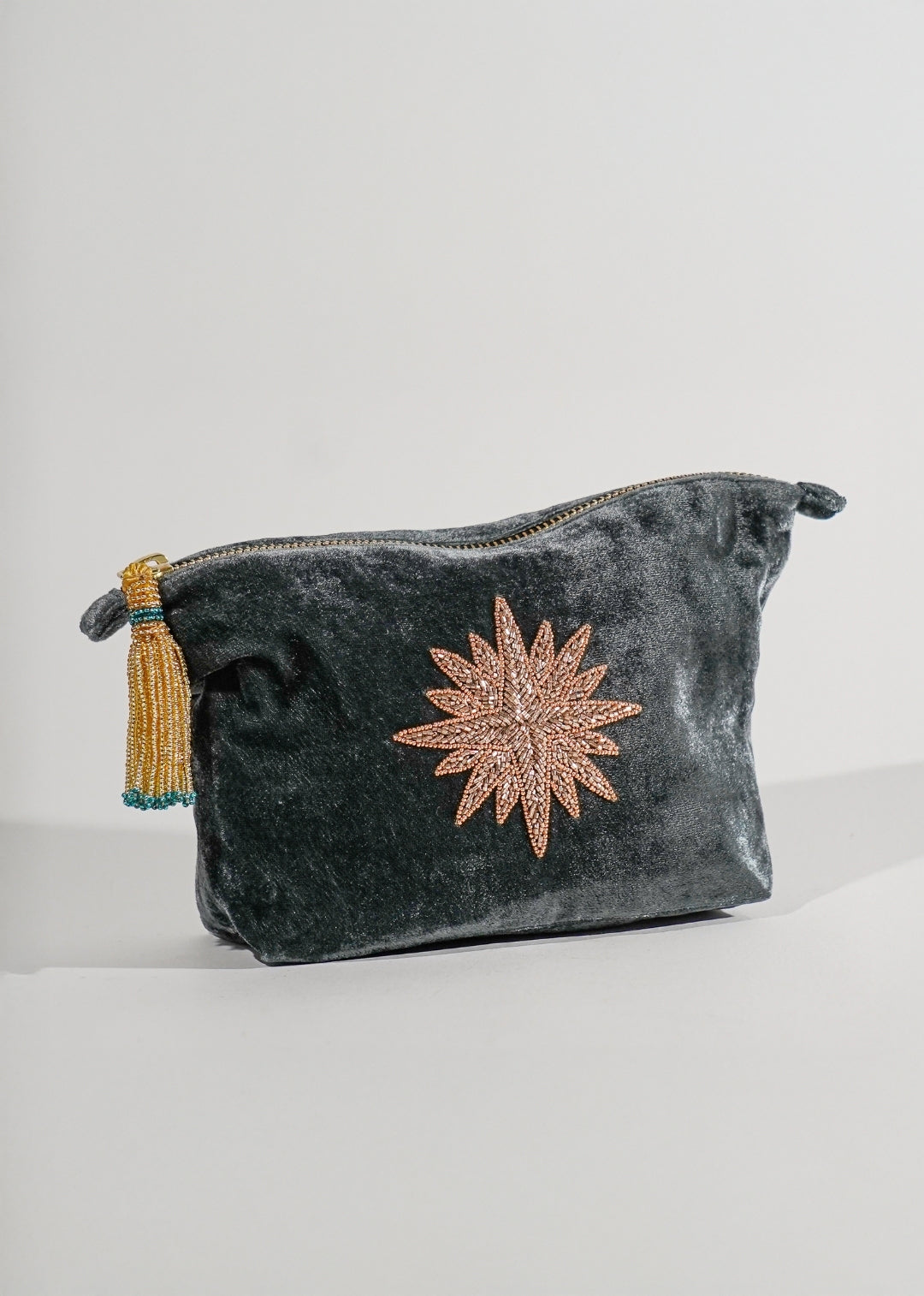 Élevez votre routine beauté avec cette trousse toute douce en velours, ornée d'une broderie main. Elle peut contenir tous vos produits de maquillage indispensables et se glisse aisément dans votre valise ou votre cabas pour aller travailler.