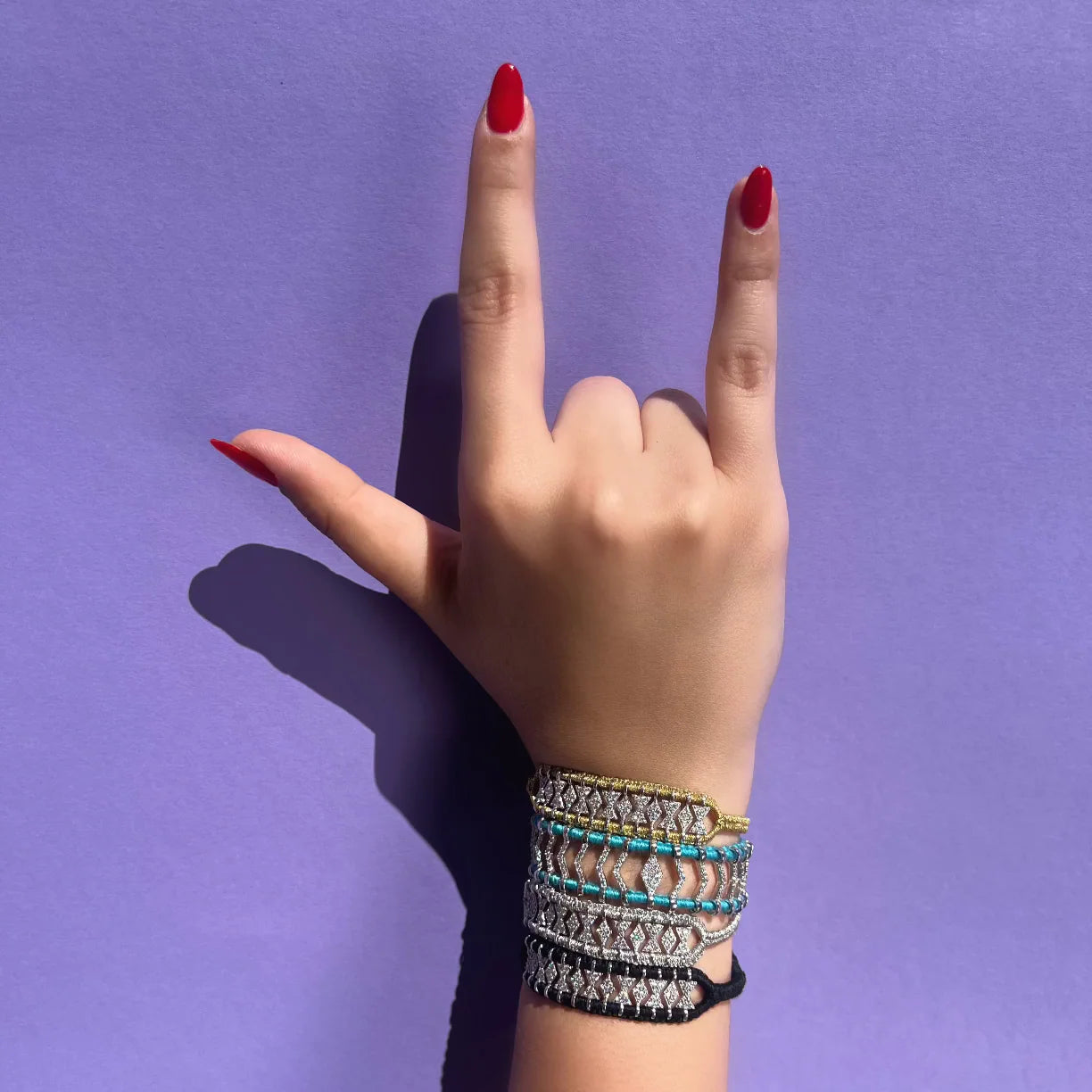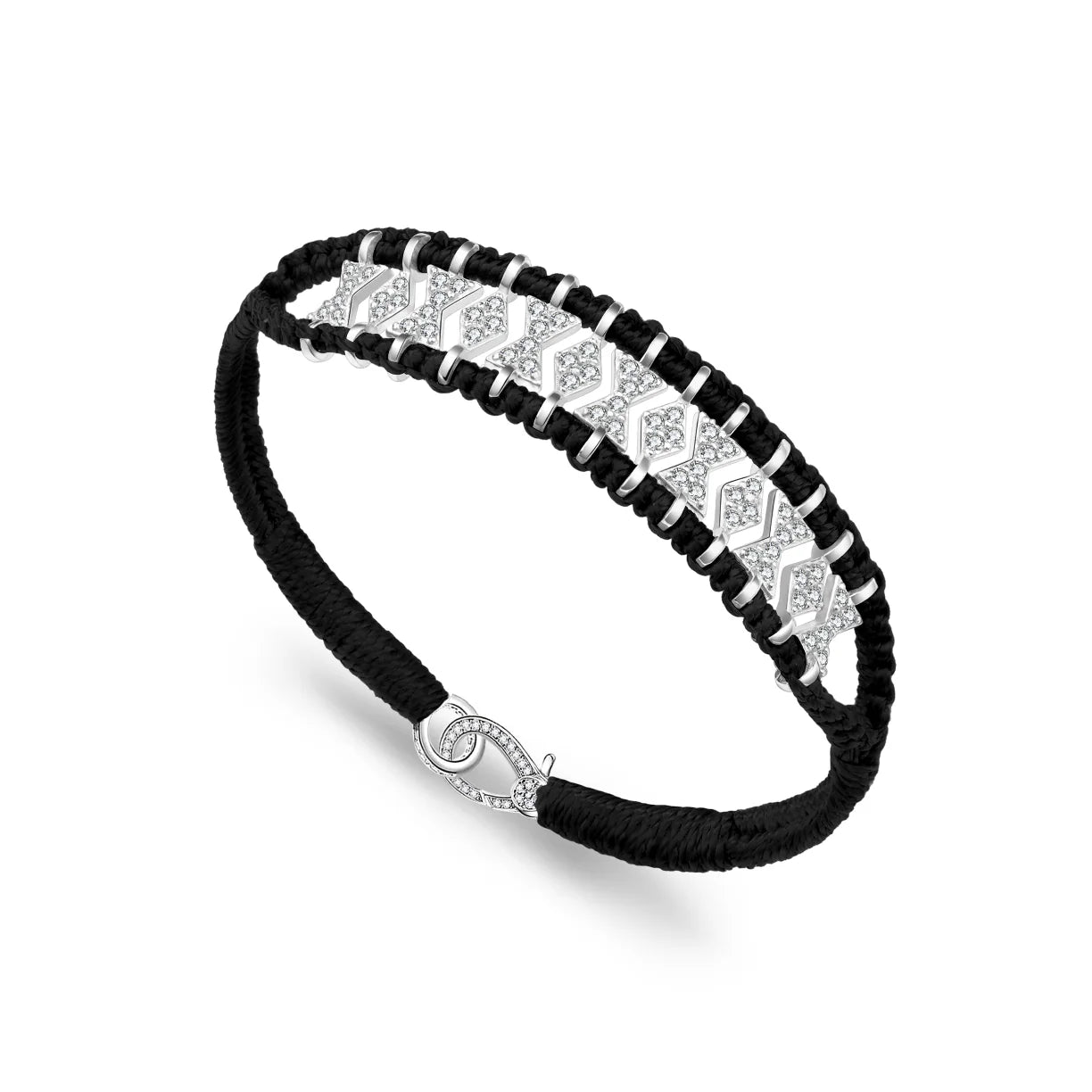 Bracelet fin en fil de coton tressé de couleur noir, décoré d’un motif en argent 925 et serti de moissanites.