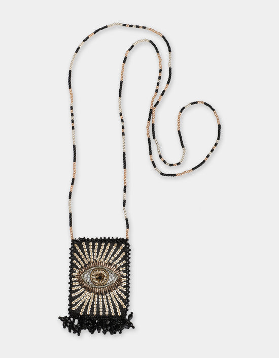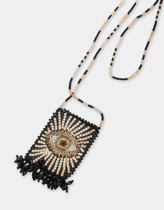 Inspiré des « scapulaires », notre collier talisman Sparkle Eye doré est brodé à la main sur du cuir fin et possède une petite poche où vous pouvez mettre votre porte-bonheur.