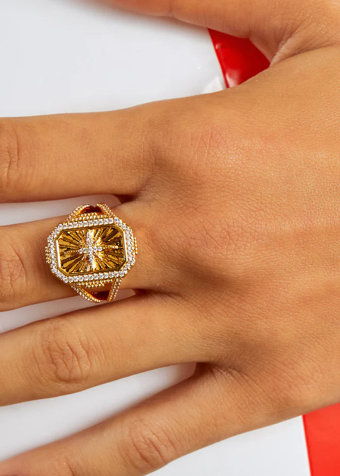 Doré à l'or fin 24 carats, ce bijou ajustable à toutes les tailles de doigts, se porte aussi bien seul qu’en accumulation pour un look lumineux et inspiré.