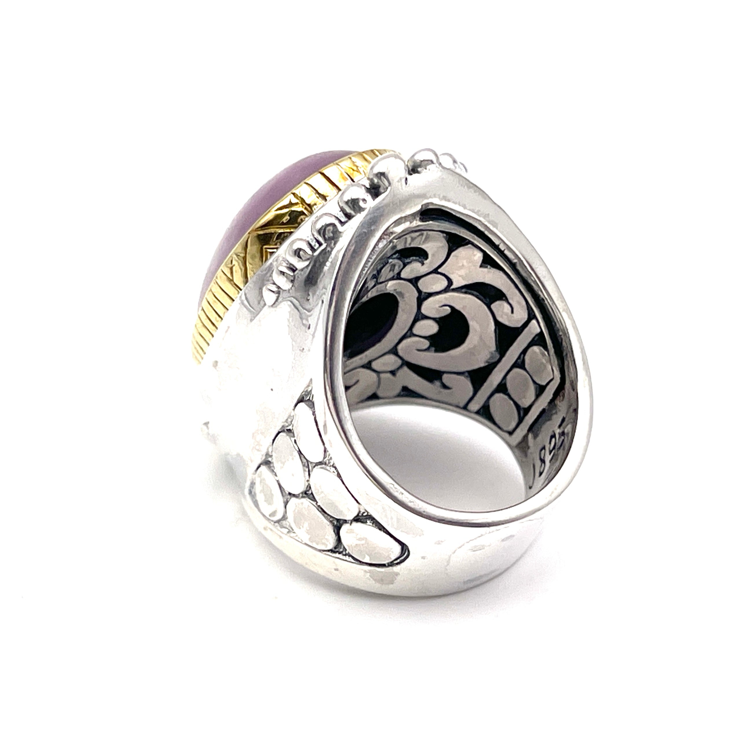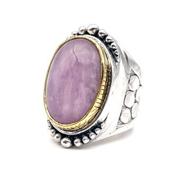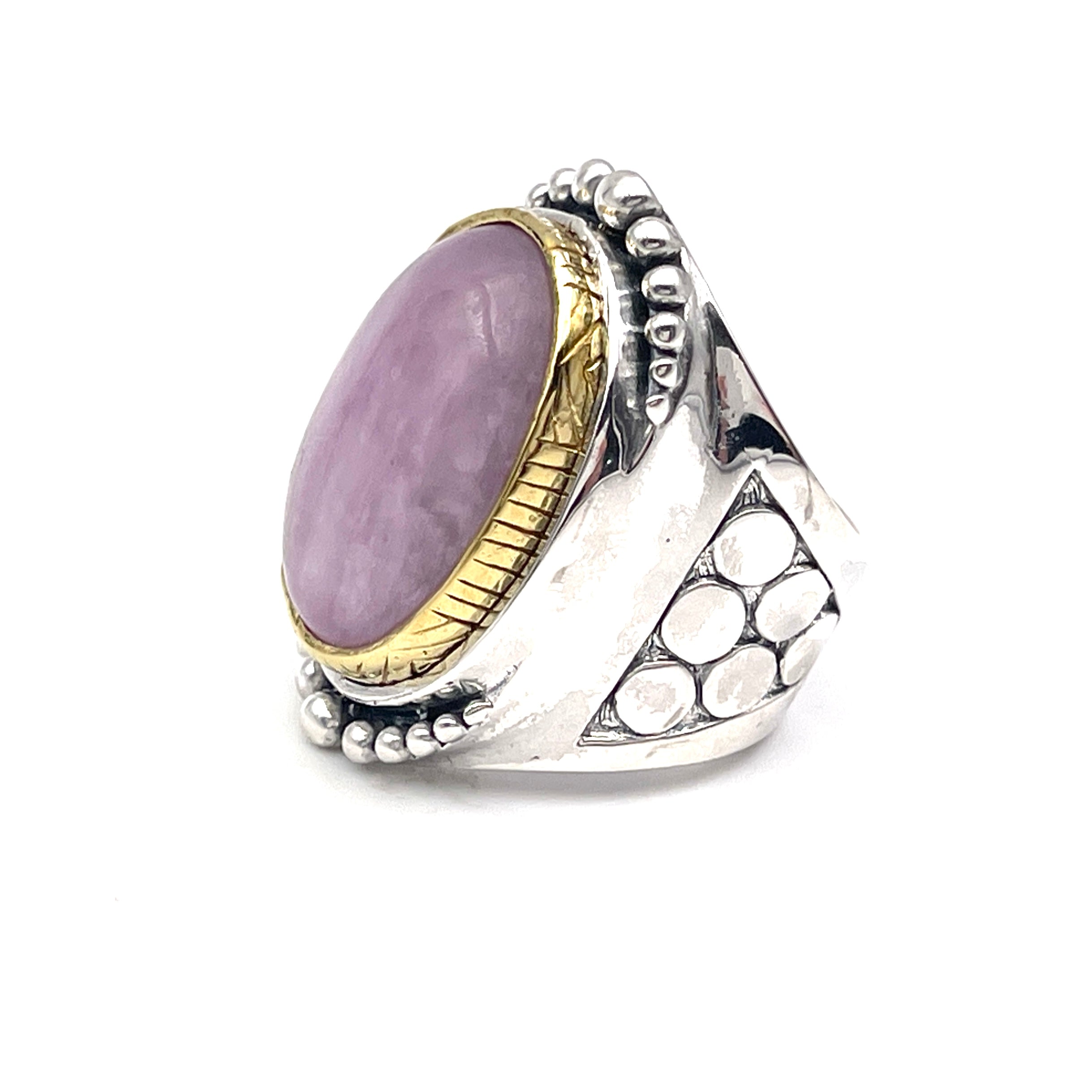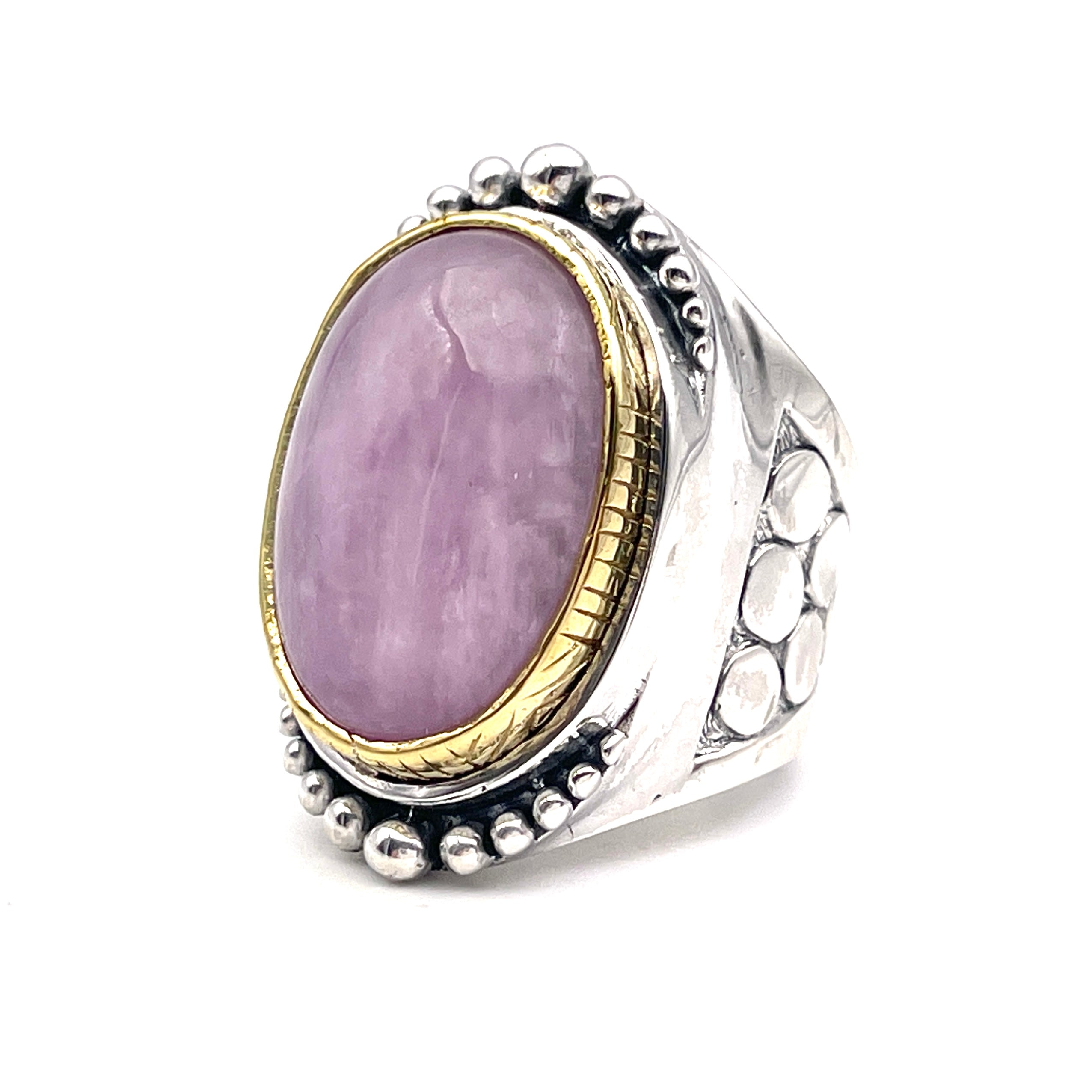 Bague en argent 925, et laiton sur l'entourage, sertie d'une pierre naturelle "Kunzite rose", taillée en cabochon.