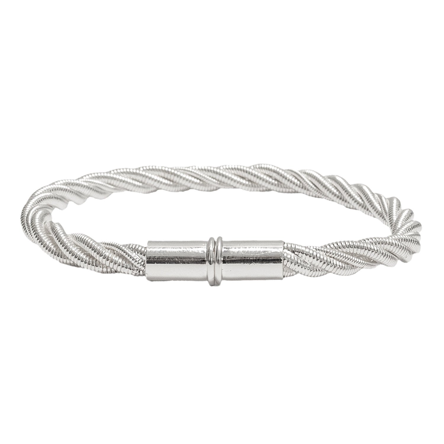 Bracelet Twist Gun en corde de basse et guitare avec fermoir douille aimantée de couleur argenté ou doré jaune pour femme.