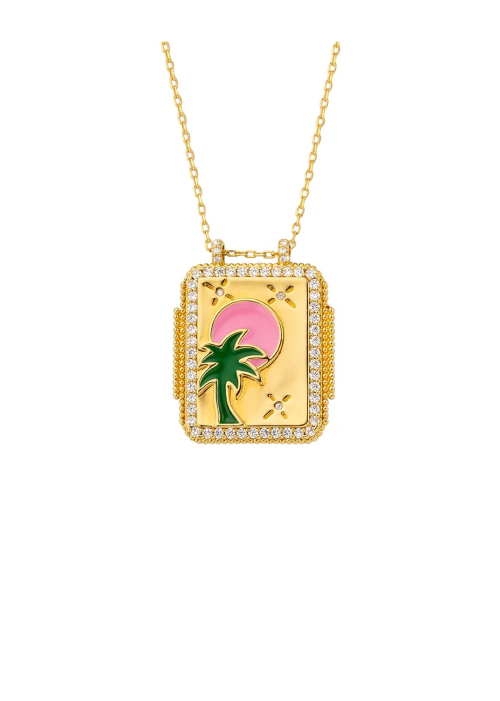 Son design carré et moderne met en scène un soleil rosé et un palmier en émail vert, pour un mix parfait entre évasion tropicale et style graphique.