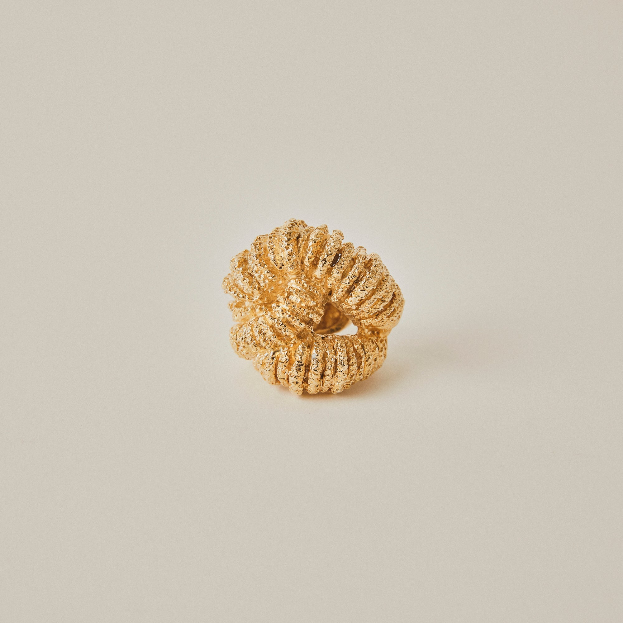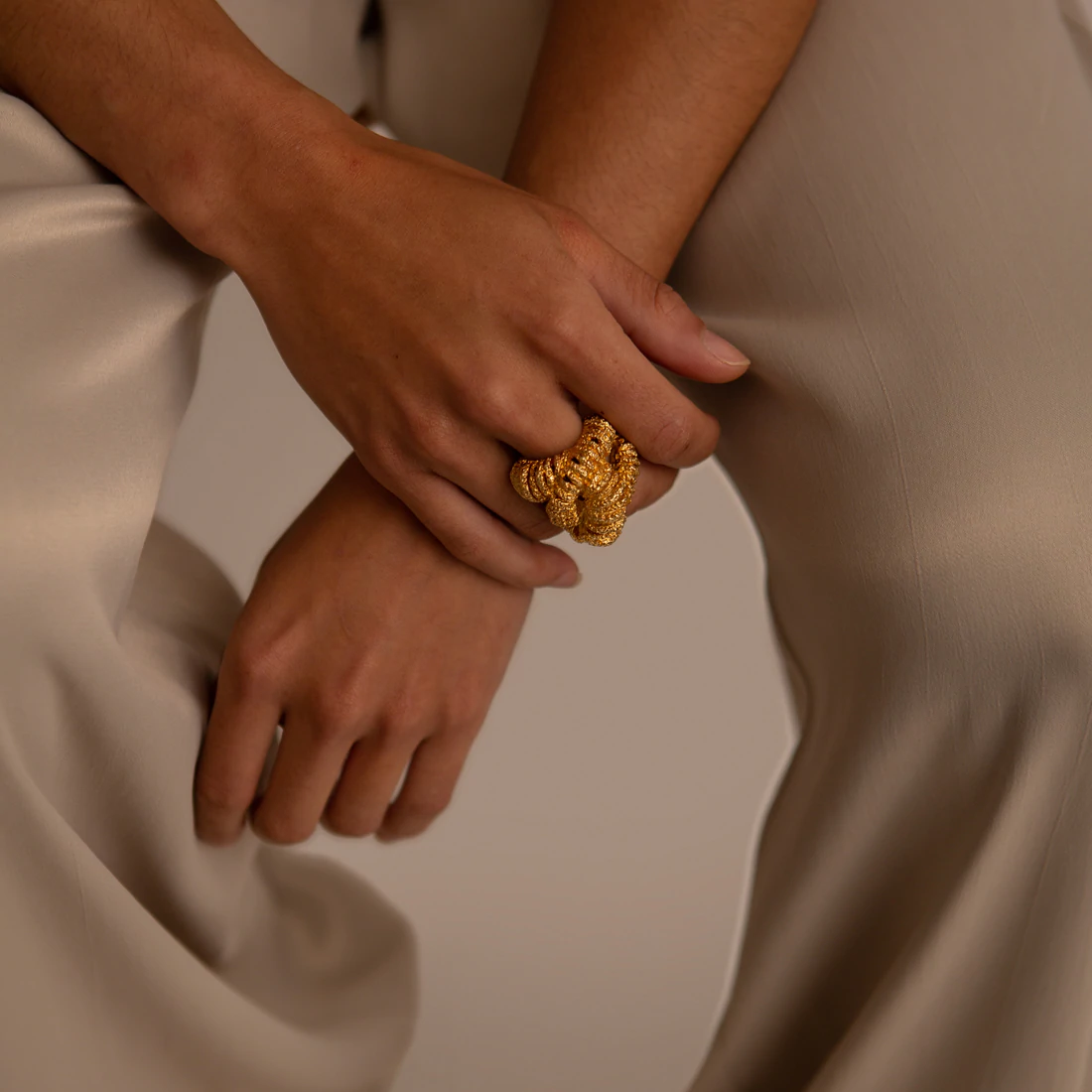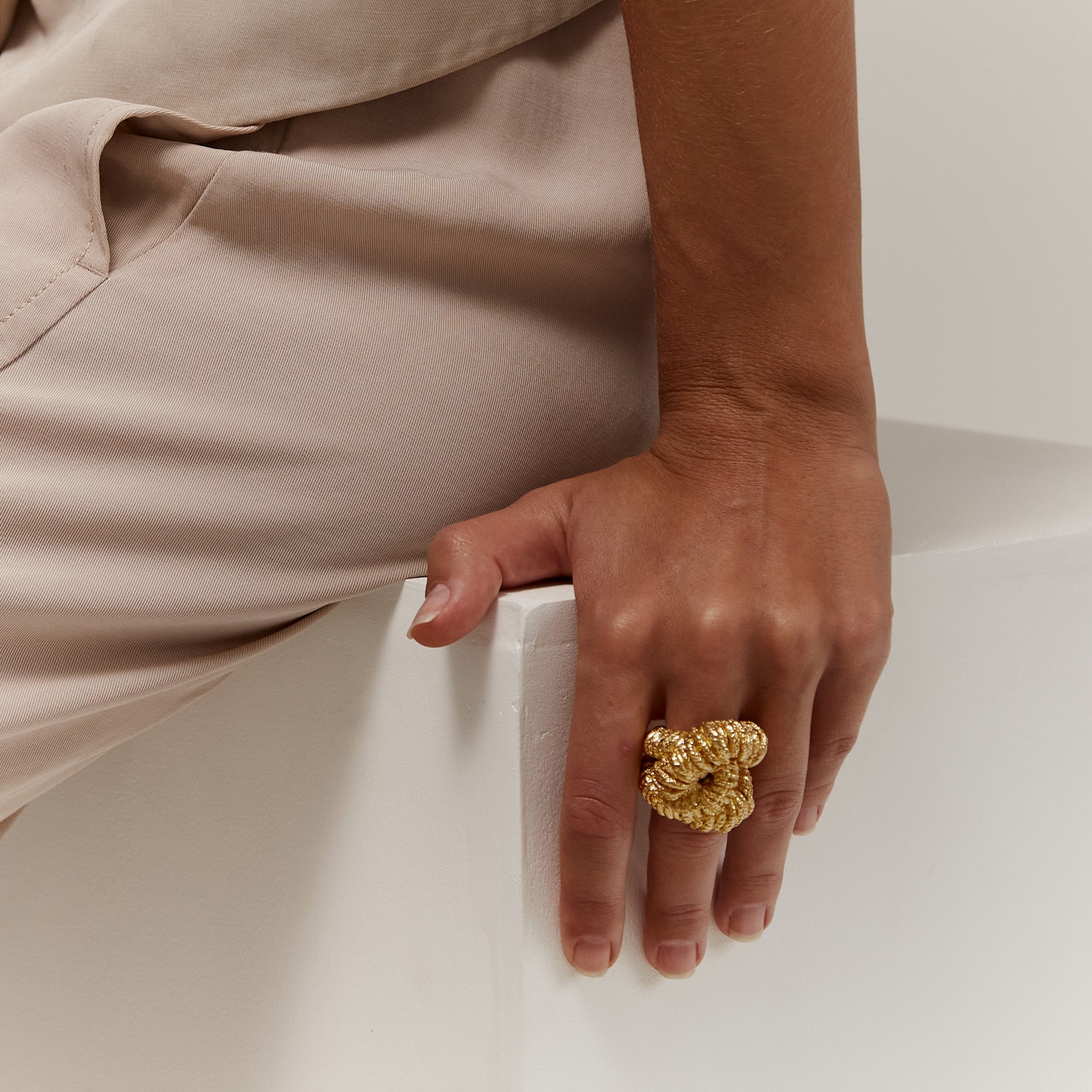 Symbole d'amour éternel et d'unité, cette bague XXL nœud en étain texturé plaqué or 18 carats, fabriquée à la main, apporte une touche de sophistication romantique. C'est l'accessoire idéal pour les grandes occasions comme pour le quotidien.
