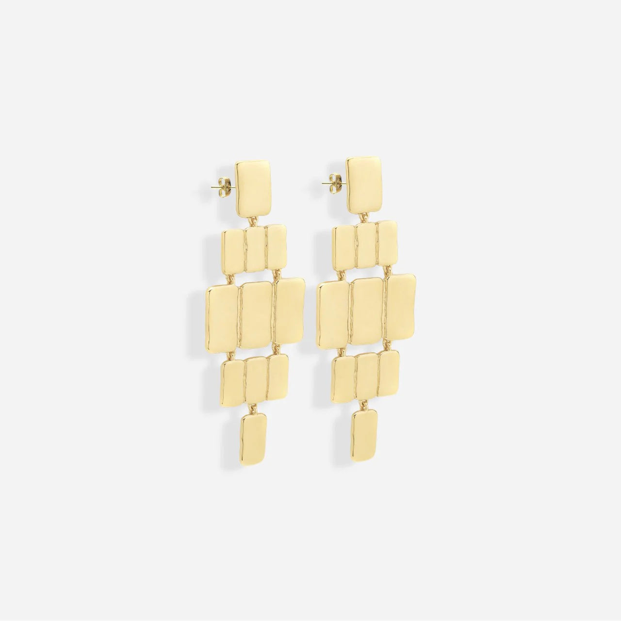 Les boucles d'oreilles Rivoli sont légères et articulées, en laiton doré à l'or fin, d'une longueur de 7,5 cm et au plus large de 3 cm.