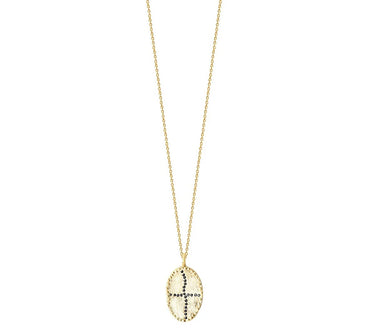 Collier de 48cm de longueur avec la médaille Bazile embossée, sertie de zircons noirs, brossée, mate et dorée à l'or fin.
