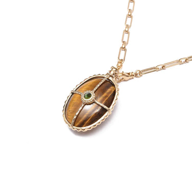 Sautoir pendentif Oeil de Tigre serti d'une Tourmaline Verte sur une face et d'une Iolite sur l'autre face, en laiton plaqué or 24 carats, 3 microns.