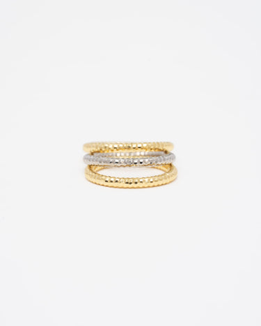 Le trio de bagues Isis Phalanx réunit trois anneaux fins au design texturé, dans des finitions dorées et argentées. Ces bagues peuvent se porter ensemble ou séparément.