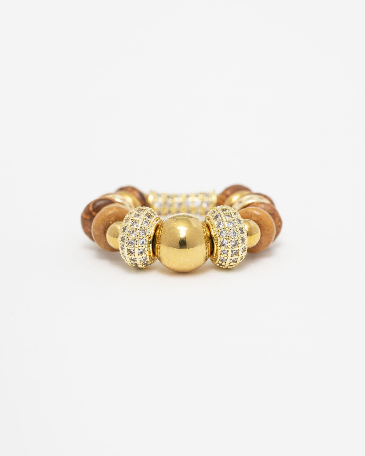 La bague Gaïa Camel associe une perle centrale dorée à un assemblage de perles jaspe camel et dorées.
