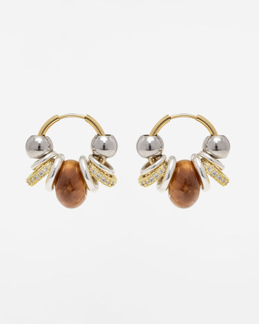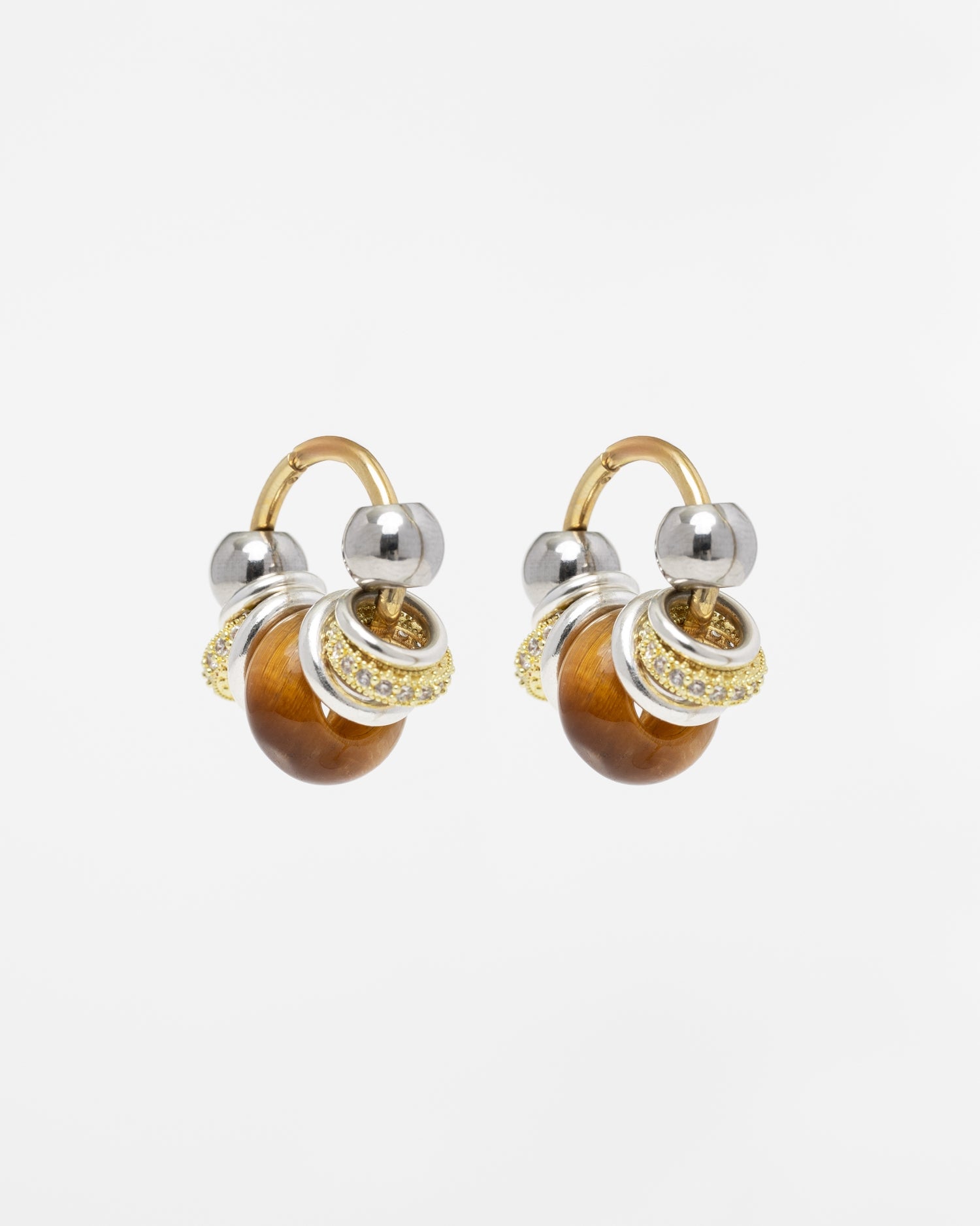 Les boucles d'oreilles Hoops Bubble Shiny Camel, créoles, se composent d'une perle oeil de tigre, entourée de perles argentées et d'anneaux dorés et argentés.