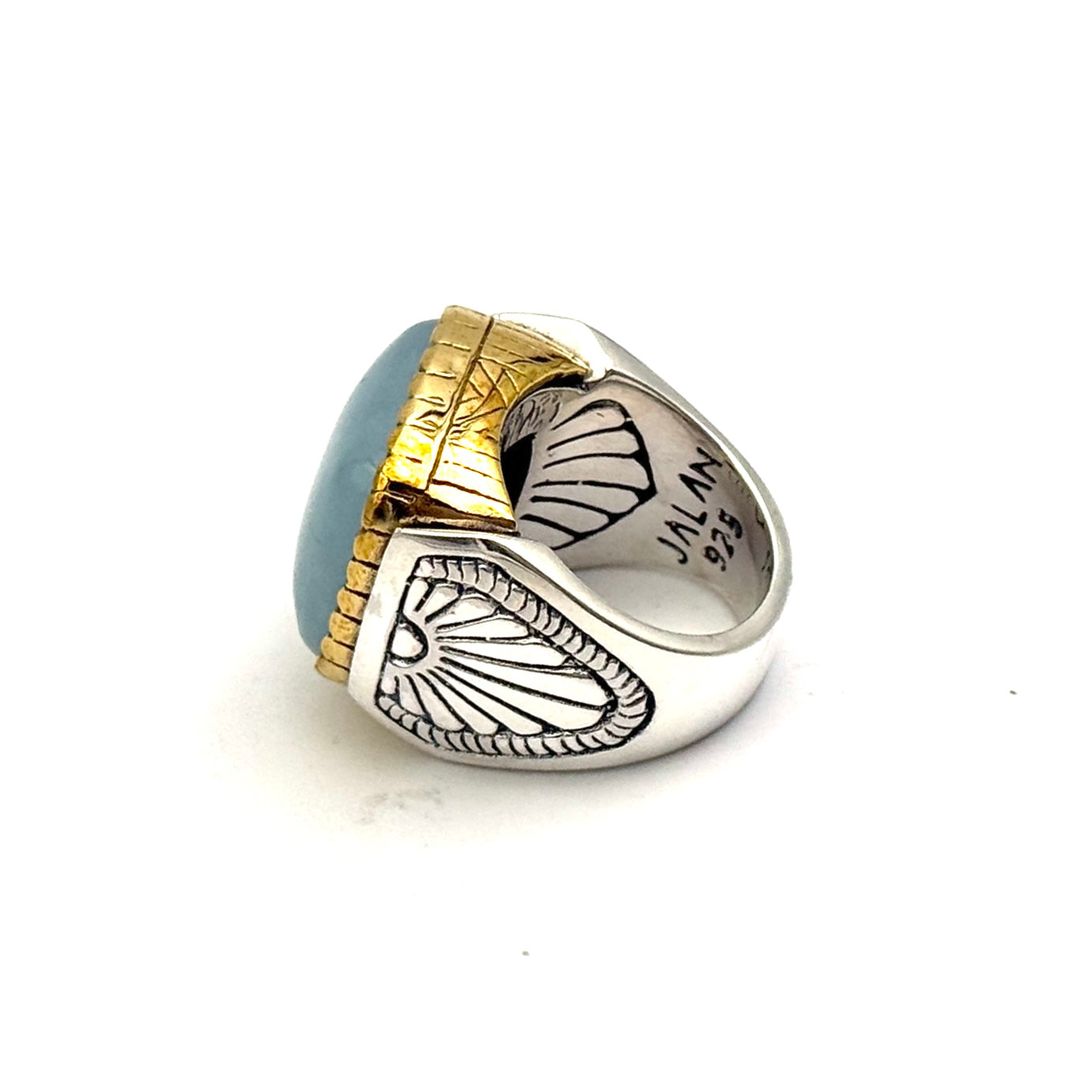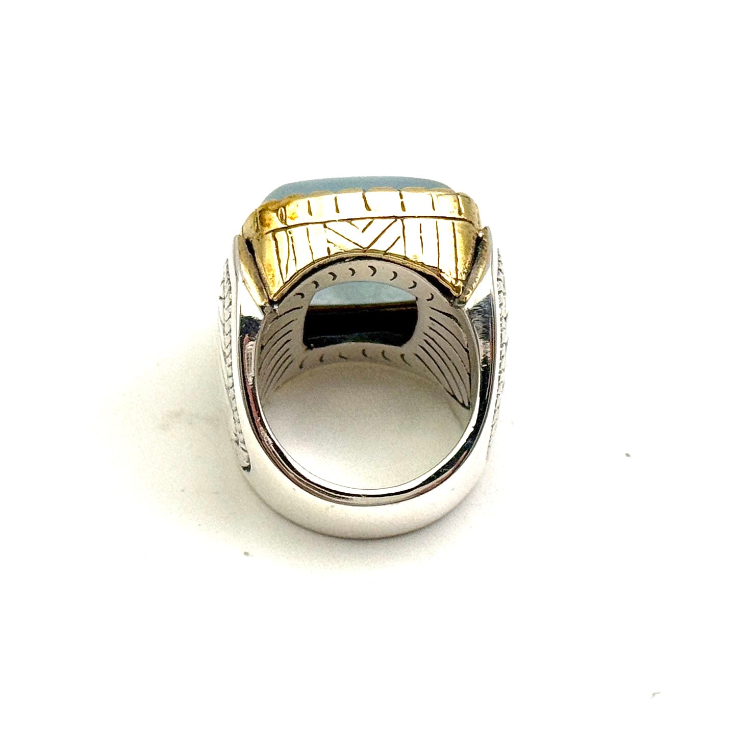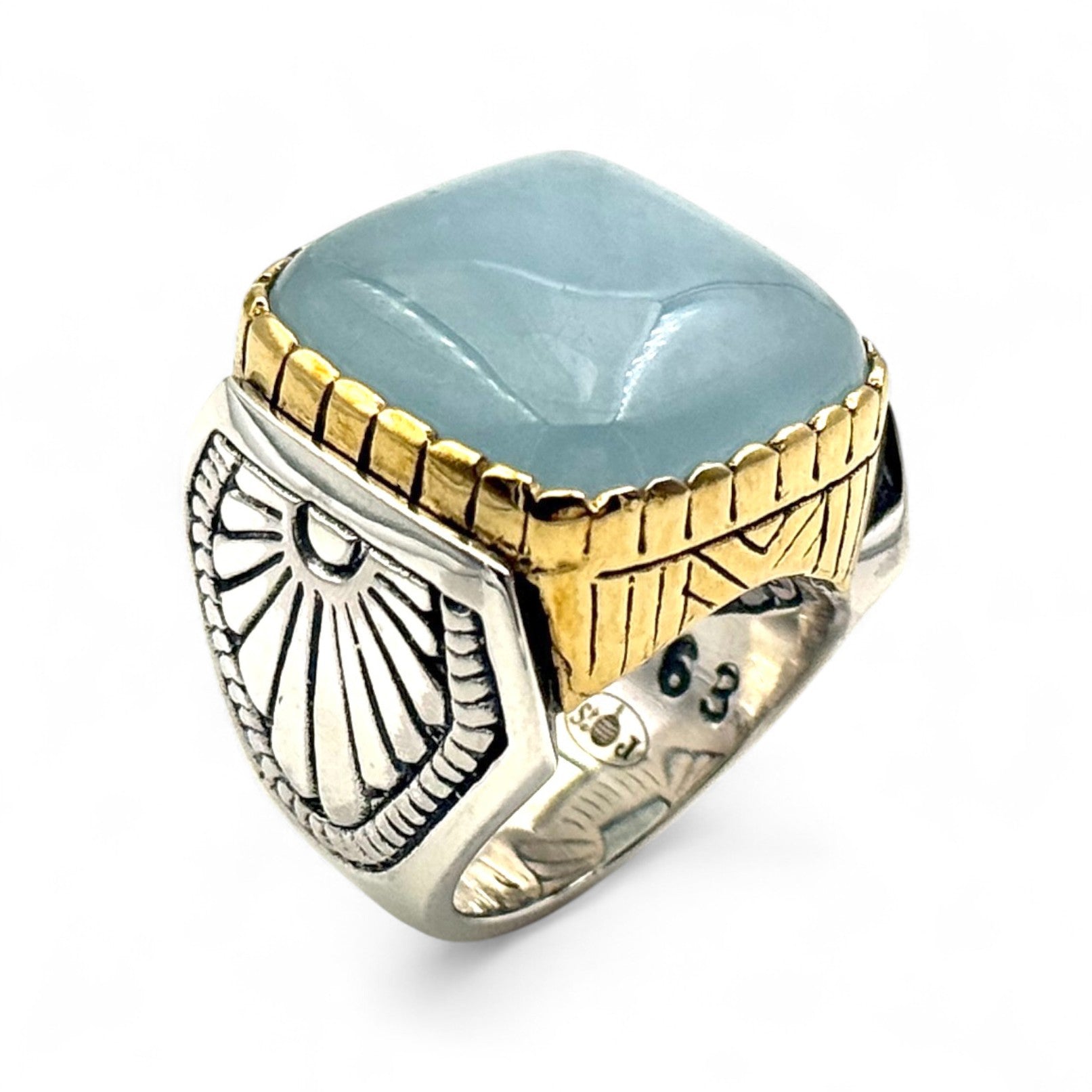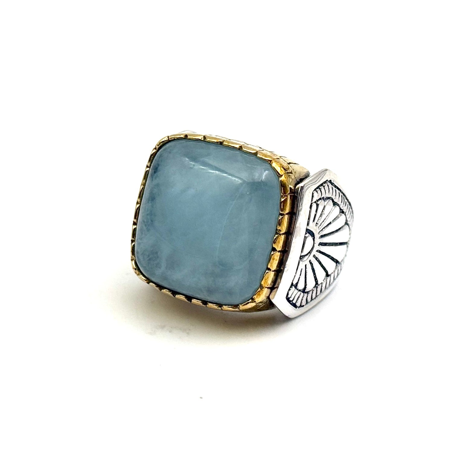 Bague en argent 925, et laiton sur l'entourage, sertie d'une pierre naturelle "Aigue Marine", carrée taillée en cabochon.