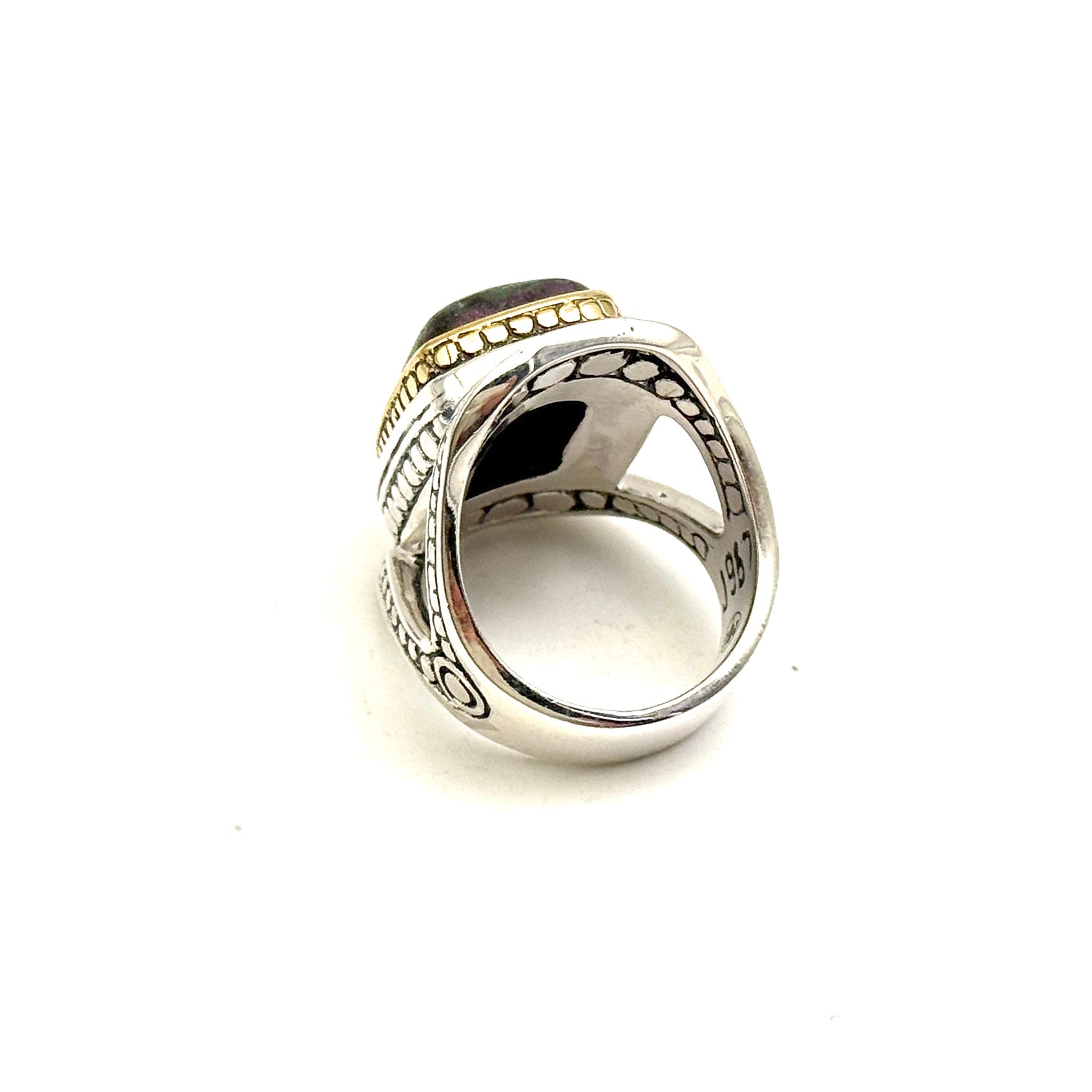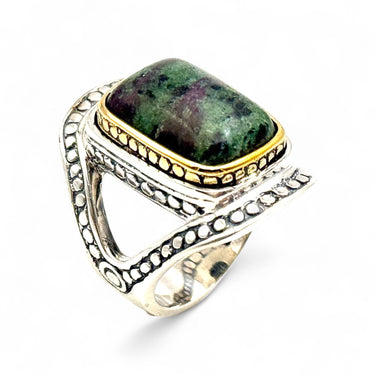 Bague en argent 925, et laiton sur l'entourage, sertie d'une pierre naturelle "Rubis zoisite", rectangle taillée en cabochon.