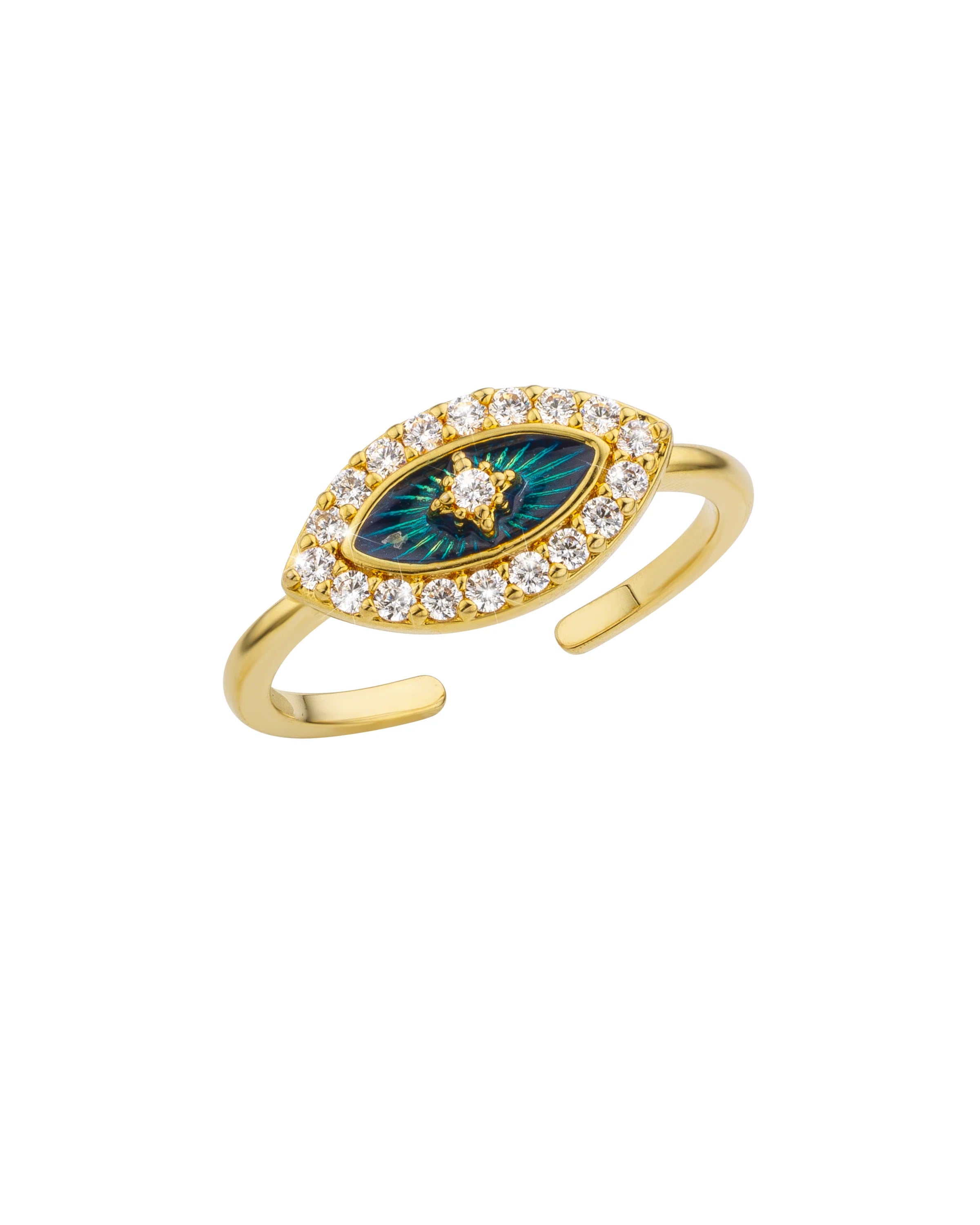 La bague BLUE EYE ESSENTIAL de MYA—BAY, dorée à l’or fin recyclé 24 carats, allie mystère et élégance avec une touche de bleu profond.