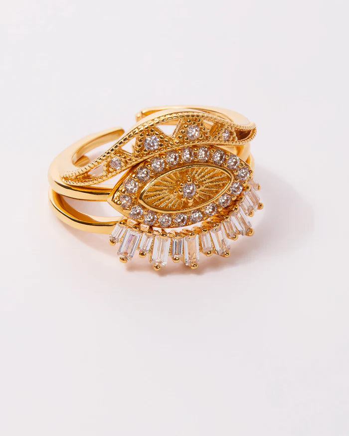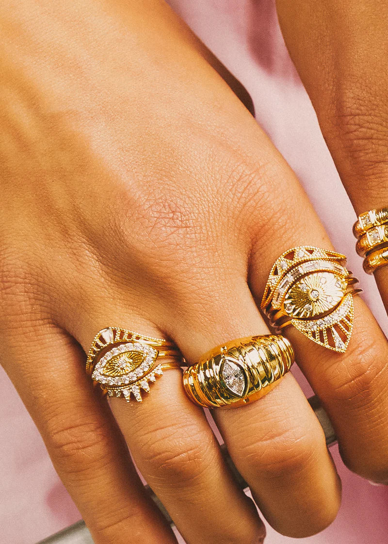 La bague EYE ESSENTIAL de MYA—BAY, dorée à l’or fin recyclé 24 carats, mêle minimalisme et mystère avec une touche d’éclat.
