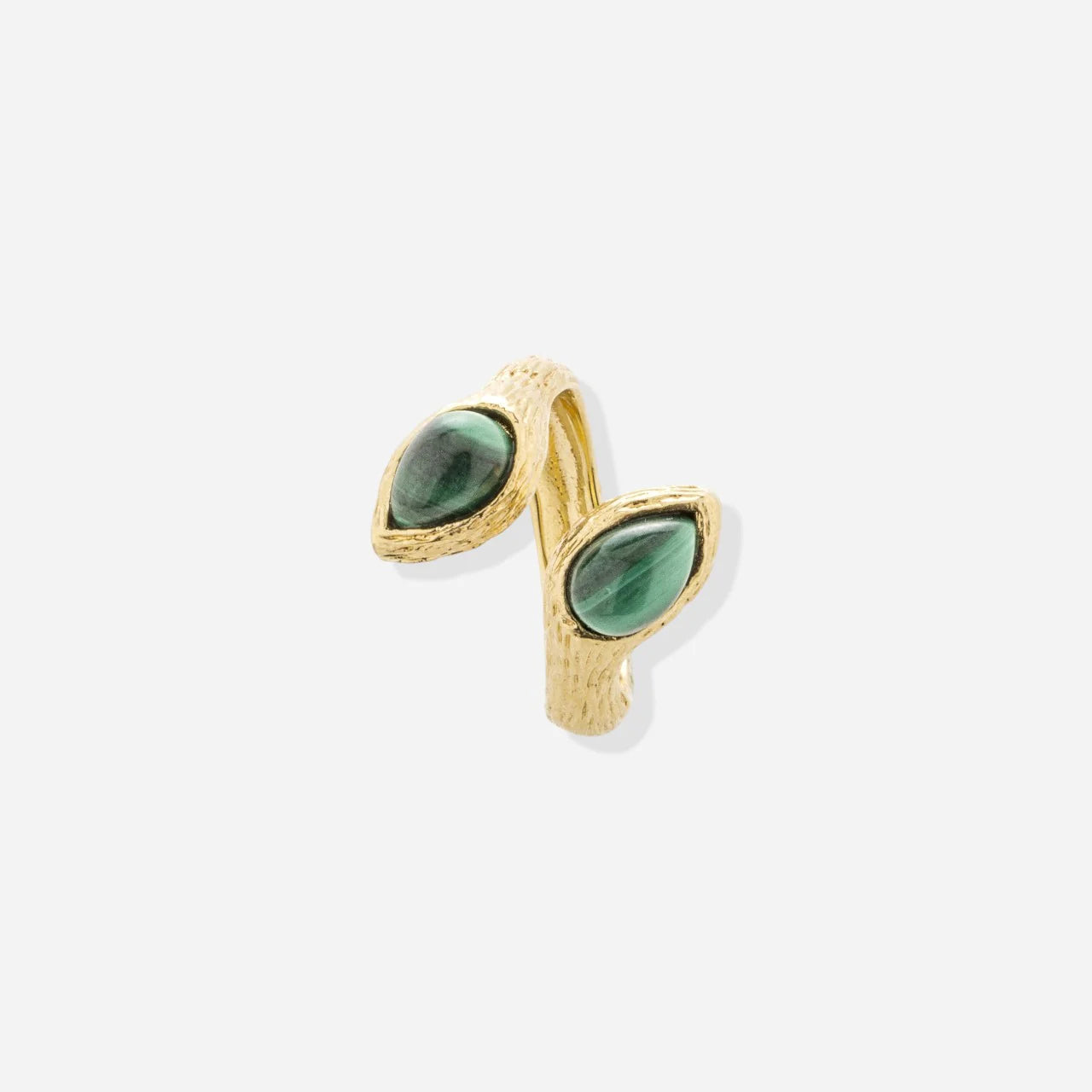La petite bague Gaia est en en laiton doré à l'or fin surmontée de deux cabochons en pierres semi précieuses (1,3 cm x 0,8 cm).