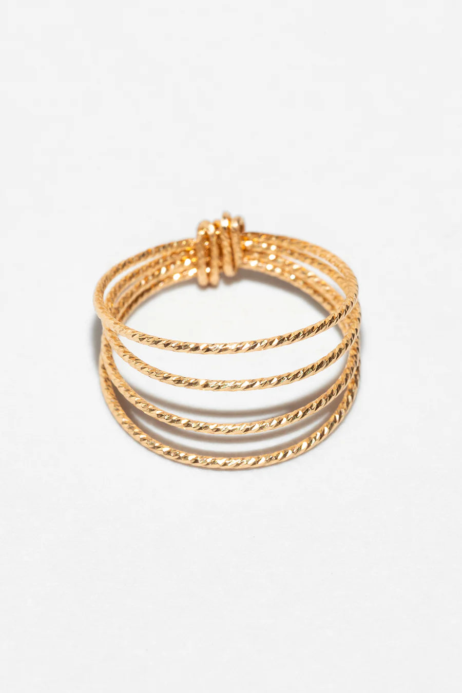 La bague Éclat multirangs dessine en filigrane des lignes d’or texturé qui enlacent le doigt, avant de se nouer en un nœud signature YAY.