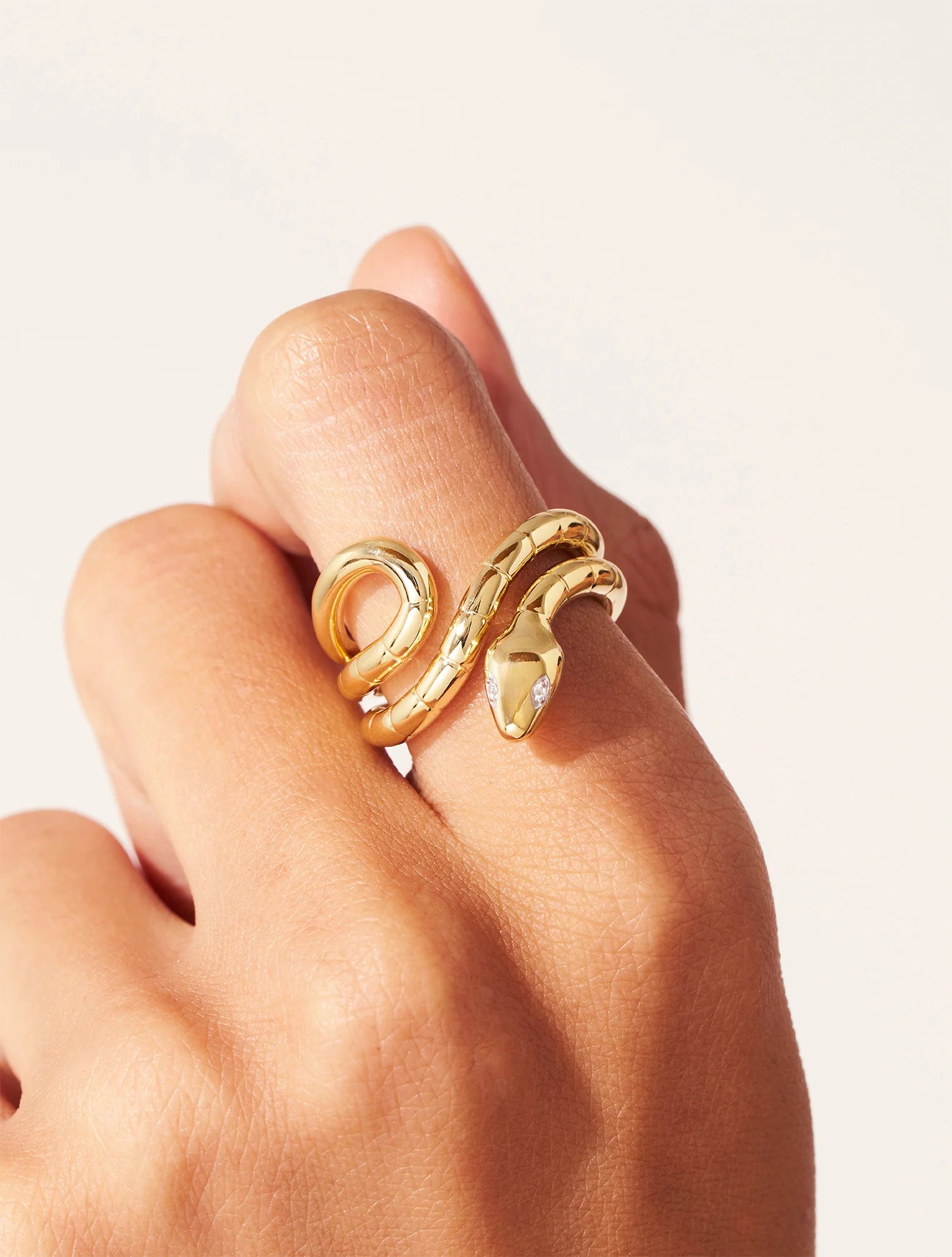 Tel un secret bien gardé, la bague Serpent en laiton doré s’enroule gracieusement autour de votre doigt. Tandis que sa tête, sertie d’un zircon blanc de chaque côté, veille avec calme et détermination, ses courbes quant à elles révèlent la maîtrise d’un savoir-faire précis. Portée seule, elle suffit à imposer une présence ; instinctive, magnétique, souveraine.