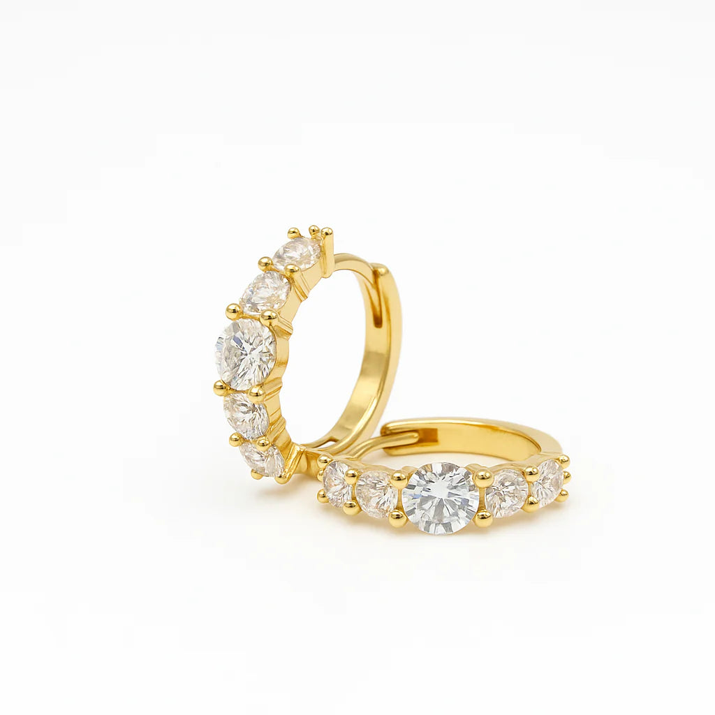 luminez votre style avec ces créoles dorées, serties de pierres scintillantes taille ronde. Chaque cristal est minutieusement serti pour refléter la lumière à 360°, offrant un éclat intense et élégant.