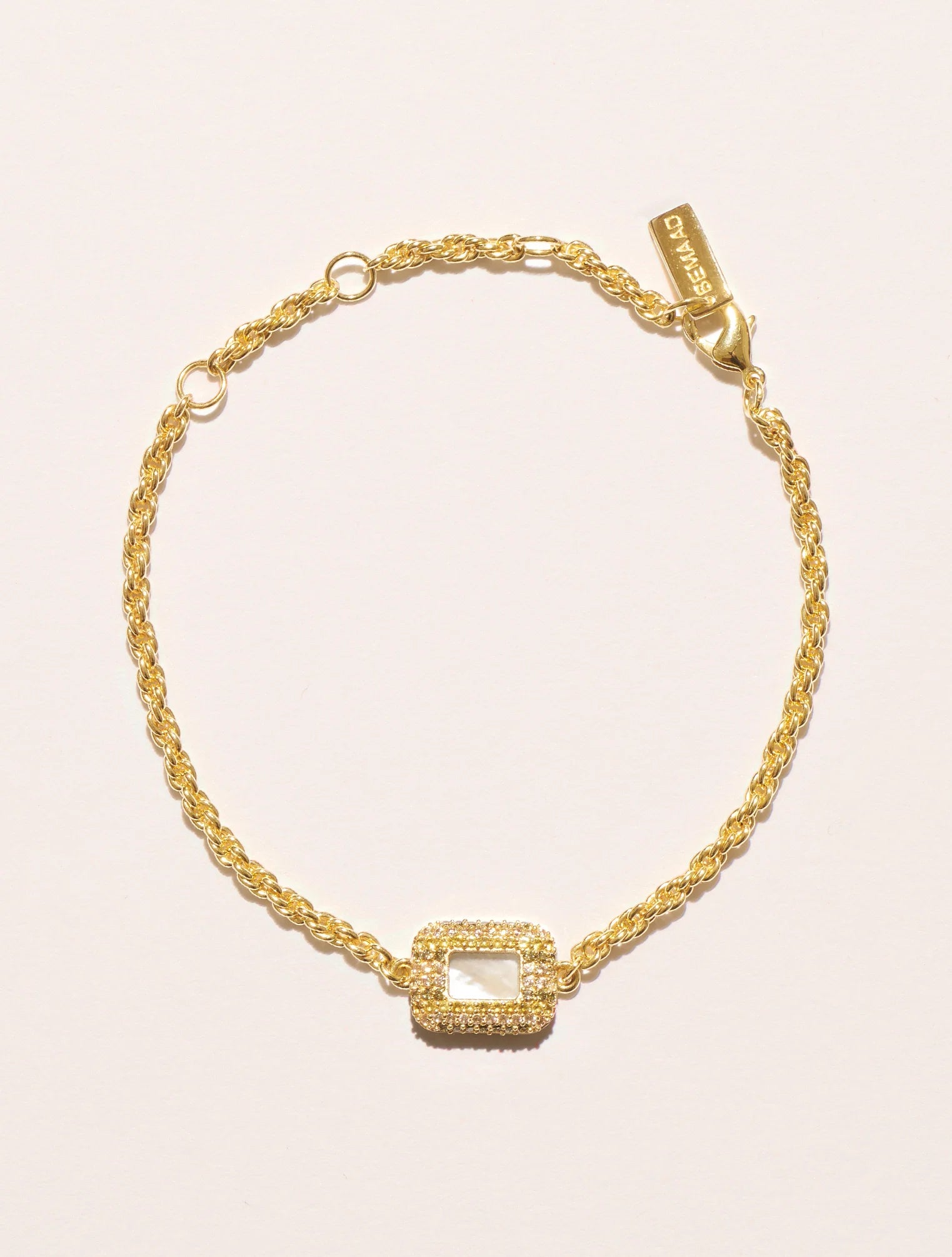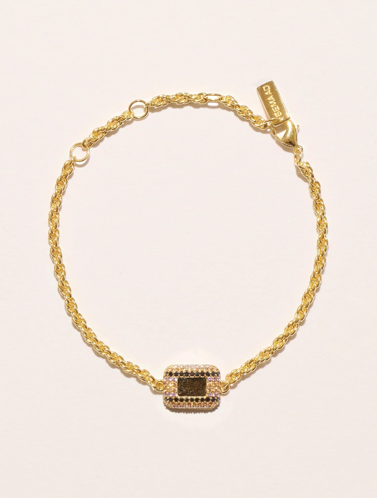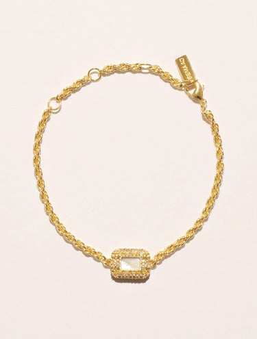 Sublimant tous les poignets grâce à son savoir-faire minutieux, il se plaît à jouer avec les textures et les couleurs. Au centre de sa chaîne dorée faite de fins maillons dorés, une pierre rectangulaire aux angles arrondis, danse avec la lumière. Autour de celle-ci, les zircons, disposés en trois rangs verticaux aux tonalités vibrantes, créent un effet graphique saisissant, amplifiant l’éclat et le relief de cette pièce.