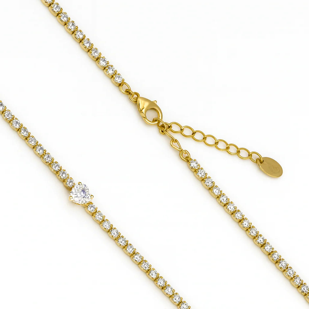 Ce collier tennis allie raffinement et éclat intemporel. Sertie de cristaux scintillants sur toute sa longueur, la chaîne dorée met en valeur un pendentif en forme de cœur, symbole de délicatesse et de romantisme.